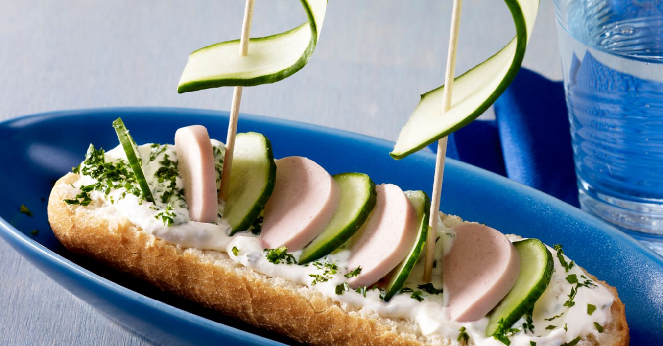 Всяко едно от дългите парчета краставица се пробожда отгоре и отдолу с клечка за зъби, за да се получи своеобразно корабно платно. На всяка багета се забождат по две платна и корабчето от багета е готово за сервиране.