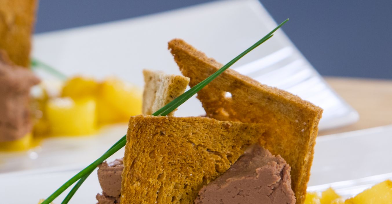 В чиния се прави канапе от ябълки и върху тях с помощта на ринг се слага пастетът. Гарнира се с брускетите и се украсява с пера див лук.