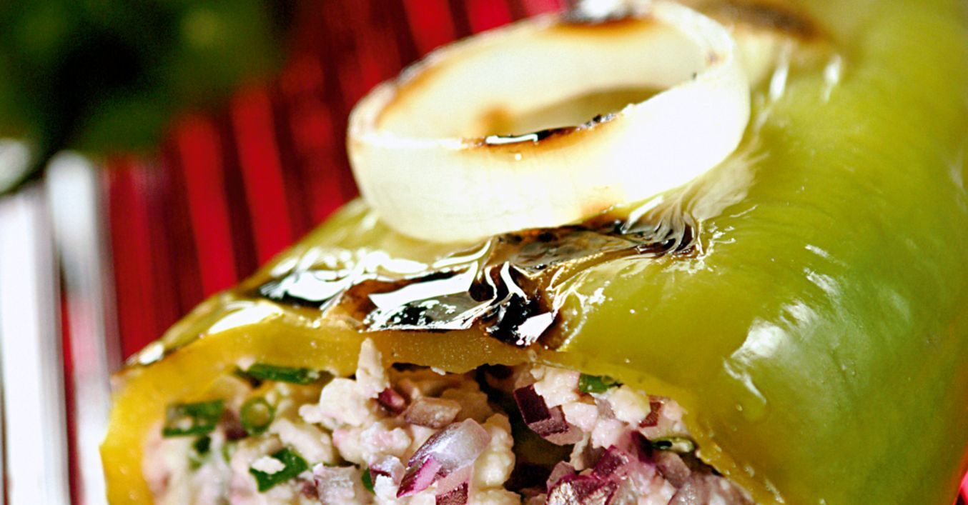 Почистените от семето и дръжките чушки се пълнят с начупеното сирене и нарязаните наситно червен и зелен лук и във всяка се сипва по 1 ч. л. зехтин.