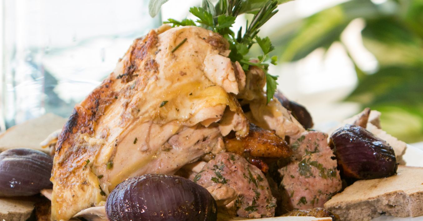 Премества се в тава, слагат се нарязаният на едро лук, салвията, мащерката, розмаринът, налива се 1 ч. ч. вода, подправя се със сол и черен пипер. Пече се в загрята на 180°С фурна за 1 час и 15 минути, като по време на печенето се маже със сока, който се отделя.
