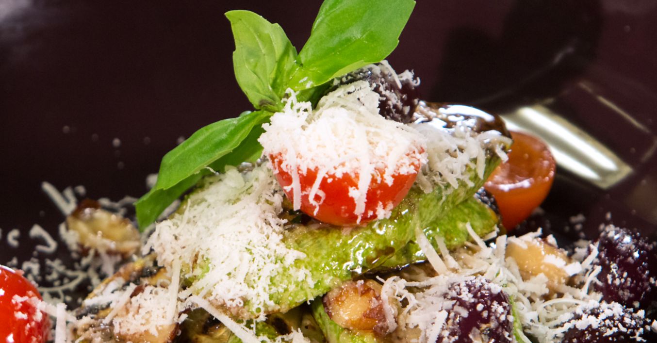 Салатата се разпределя в чинии и се поръсва с наситнения босилек и настъргания пармезан.