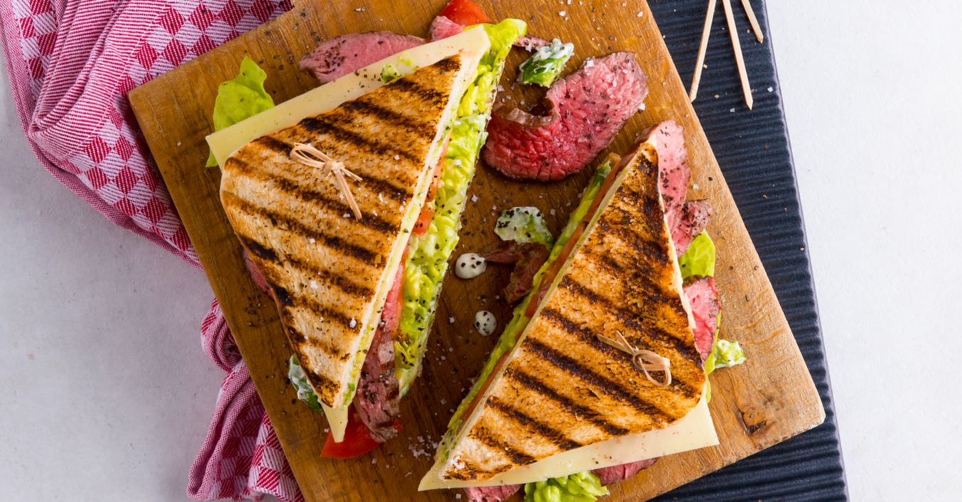 Филиите хляб се запичат на барбекюто. Телешкият стейк се запича от всяка страна за 2-3 минути и се нарязва на тънки парчета. Хлябът се намазва с пастета от авокадо и върху четири от филийките се нареждат салата, домат, месо и кашкавал. Отгоре се слага по още една препечена филийка, сандвичите се разрязват по диагонал и се сервират.