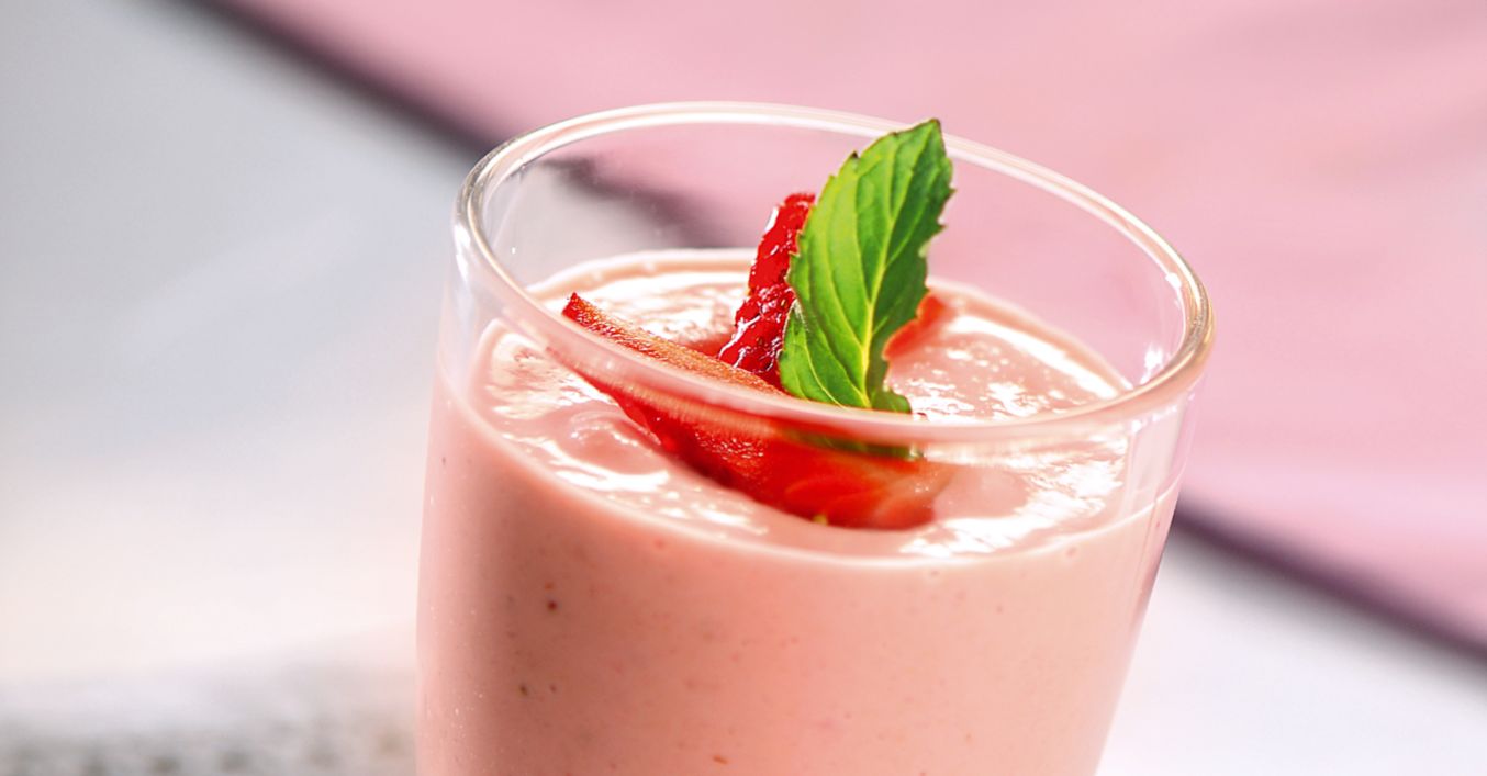 Получената кремообразна смес се сипва във висока чаша и се украсява с отделените нарязани ягоди.