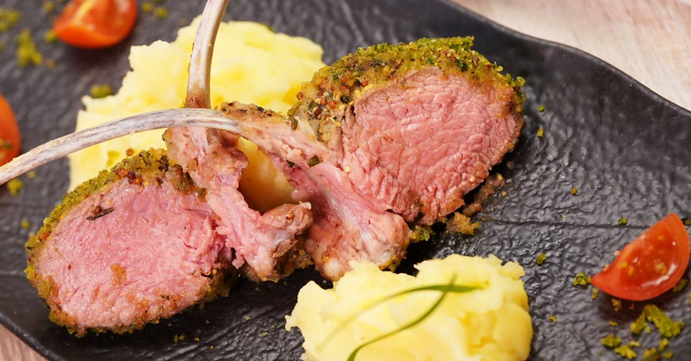 Запечатаното агнешко се намазва с горчица от двете страни и след това се овалва добре в трохите. Слага се върху тава с кухненска хартия и се пече 20-25 минути в предварително загрята на 200°C фурна.