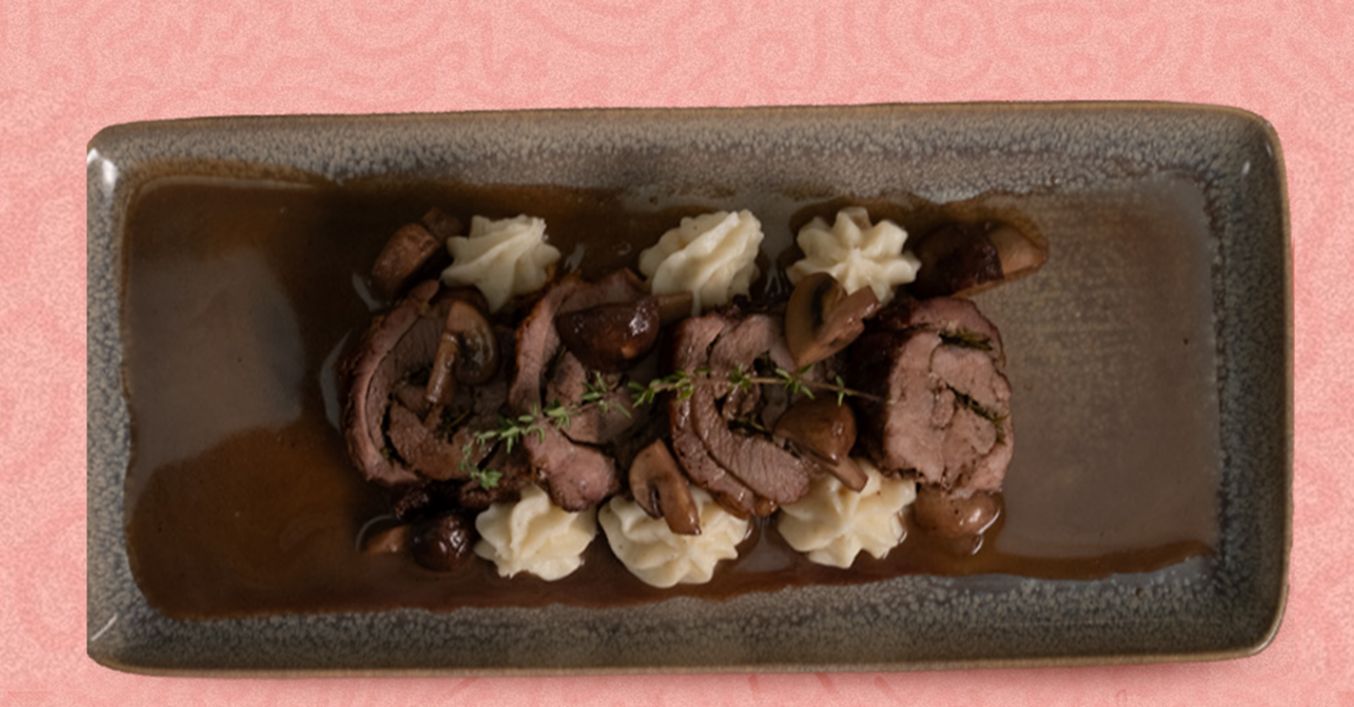 Агнешко руло с печен сос, горски гъби и картофен крем