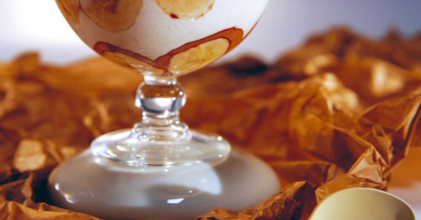 Бананът за украса се реже на колелца. В десертна купичка или чаша се поставят колелца банан и около тях се налива шоколад. Покриват се с част от банановия крем, редят се 1-2 резена банан, полива се с шоколад и отново се покрива с крем. Върху десерта се поставя фолио и се охлажда в хладилник.