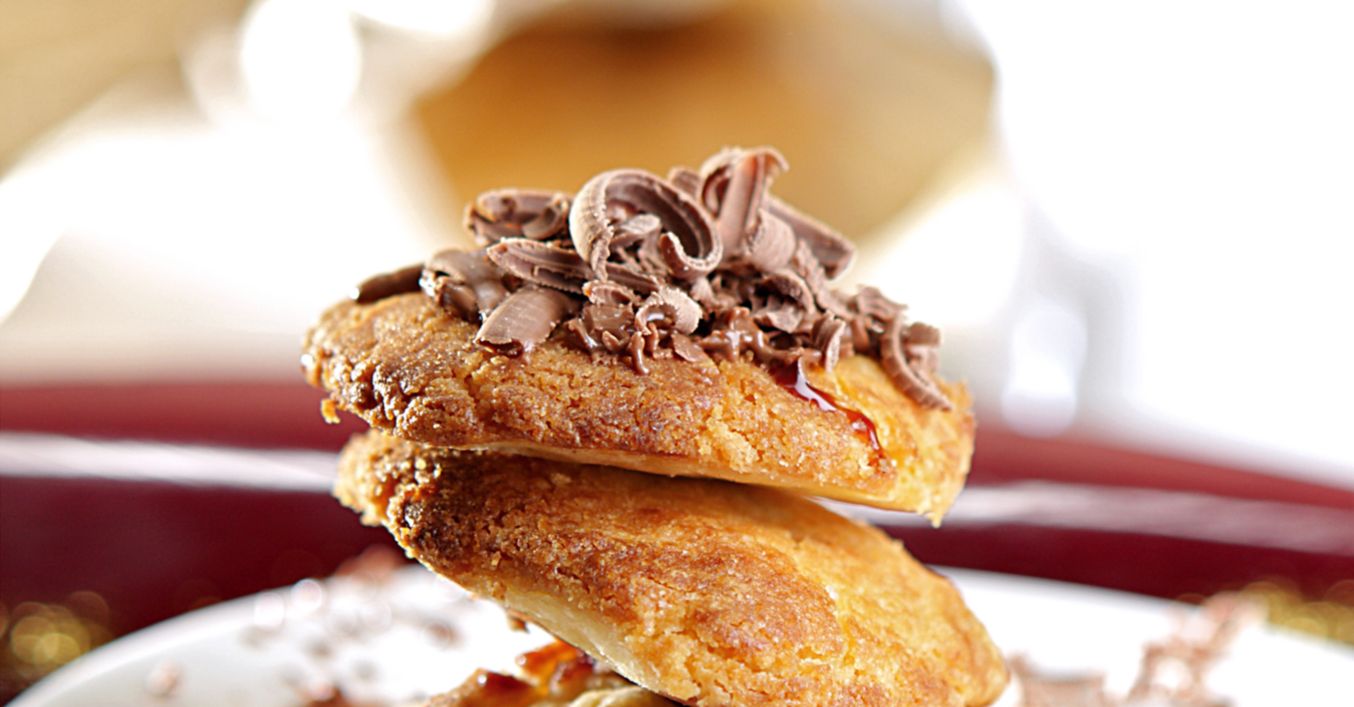 Фурната се загрява на 200°С. От тестото се оформят топчета, които се натискат, за да се сплескат. В тях се слага по 1 парченце от натрошения шоколад. Бисквитите се пекат около 10 минути до златисто. След като изстинат, се украсяват с какао, пудра захар и топинг.