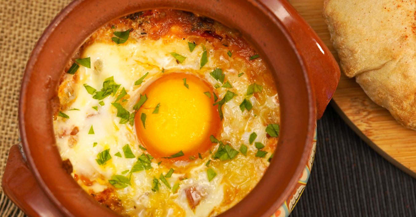 Похлупват се отново и се връщат във фурната за още 5-10 минути или докато яйцата се сготвят. Готовите гювечета се сервират поръсени с пресен магданоз.