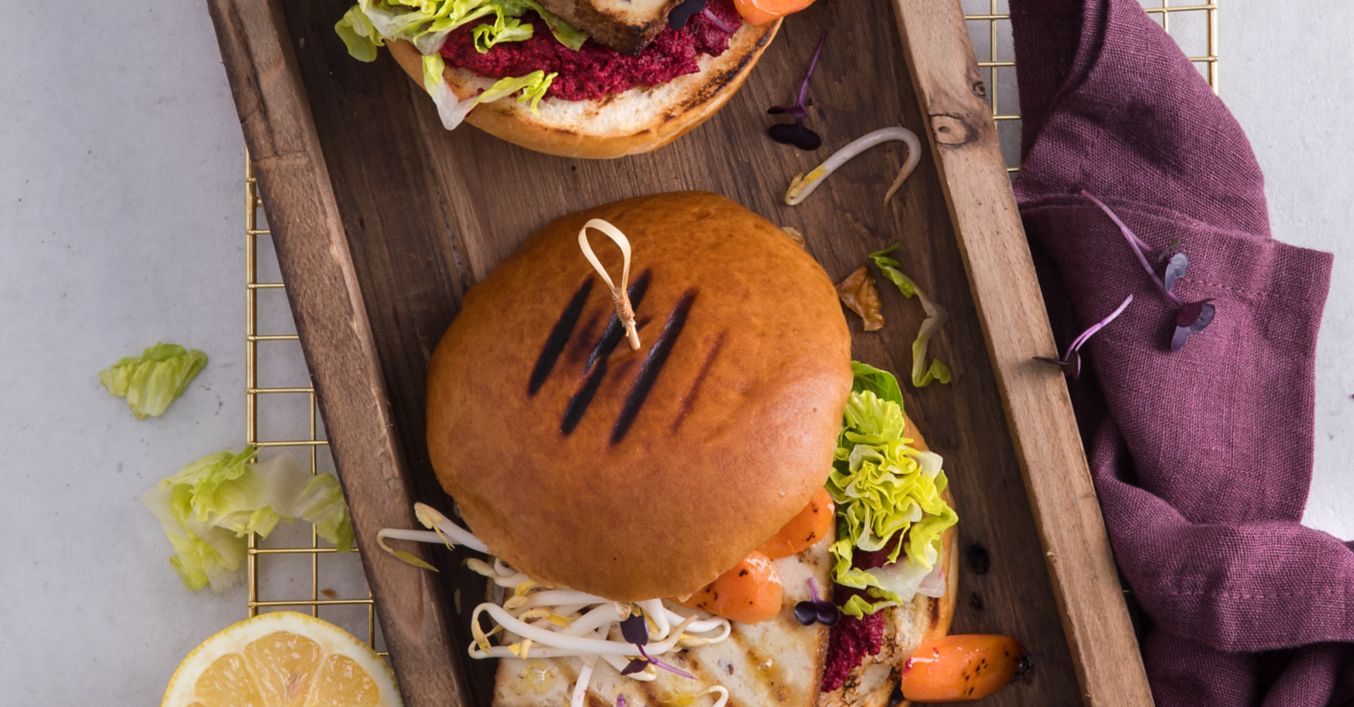 Половинките багети се намазват с крема от червено цвекло. На долните половинки се слагат зелената салата, тофуто, морковите и кълновете. Поставят се горните половинки и бургерът се сервира.