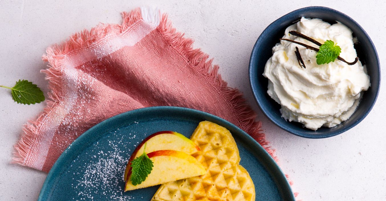 Заквасената сметана се разбива с малко ванилова захар и се сервира към готовите вече гофрети.