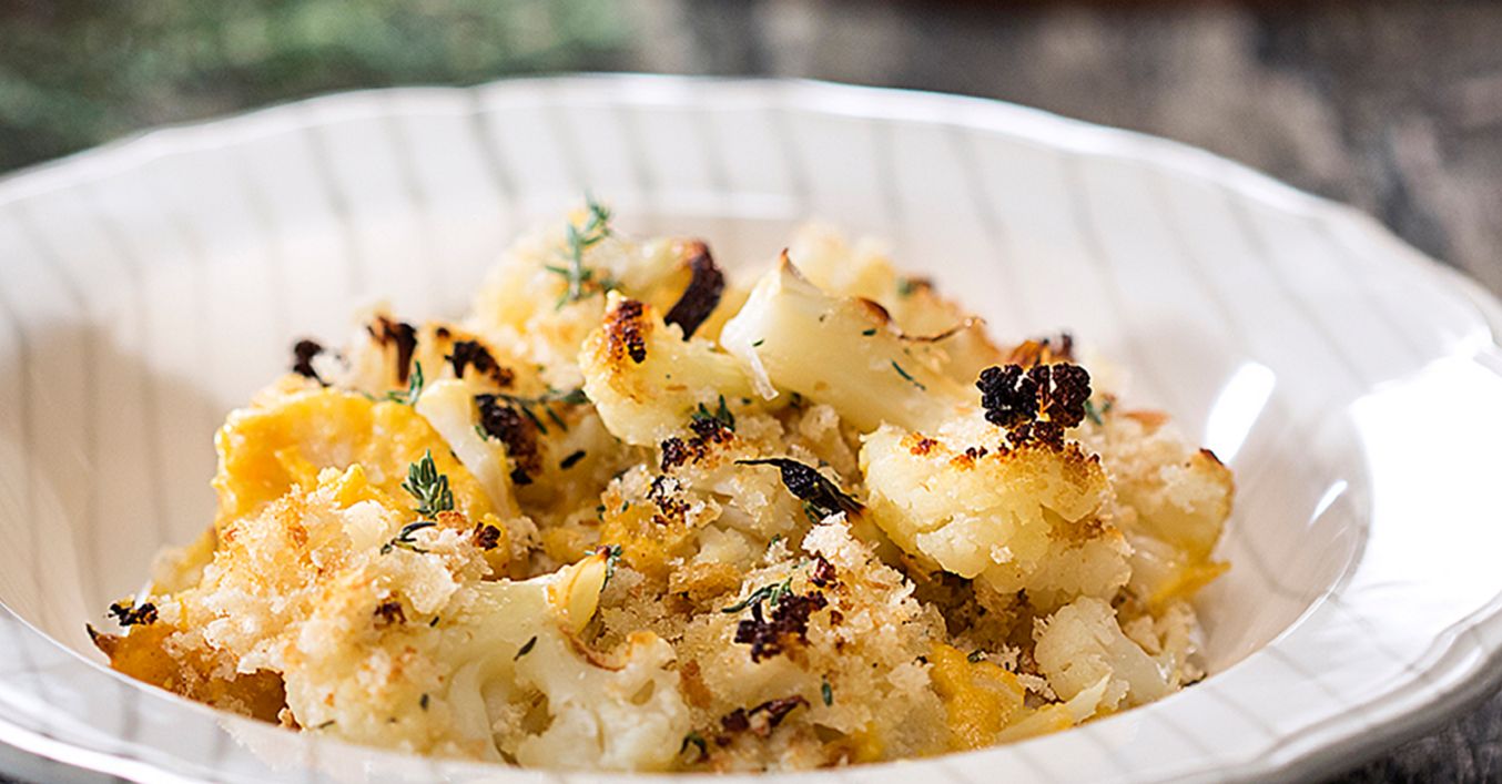 Гратенът с карфиол и картофи се сервира с наситнена прясна мащерка.