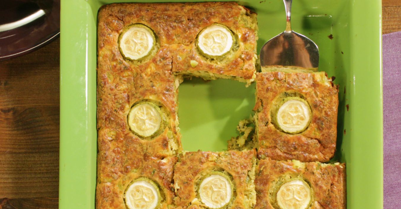 Сместа се изсипва в намазана с маслиново масло тавичка и отгоре се подреждат шайби от тиквичката за украса.