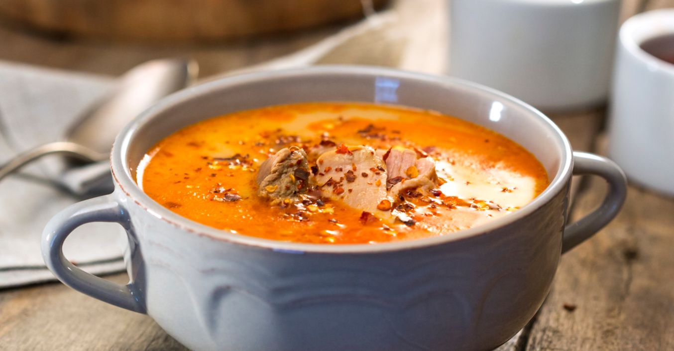 В друг съд се сгорещява маслото и в него се запържва брашното до златисто. Сипва се червеният пипер и веднага се наливат няколко черпака от горещия бульон. Разбърква се и запръжката се налива в супата. В нея се пуска и месото. Оставя се да къкри 10 минути на котлона.