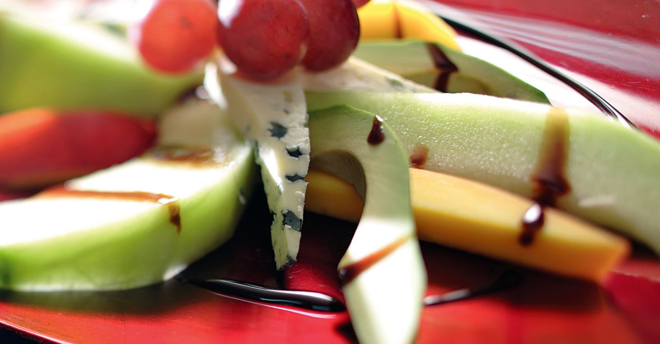 Авокадото и пъпешът се нарязват на ленти по дължина и заедно с резените манго се подреждат в подходяща чиния.