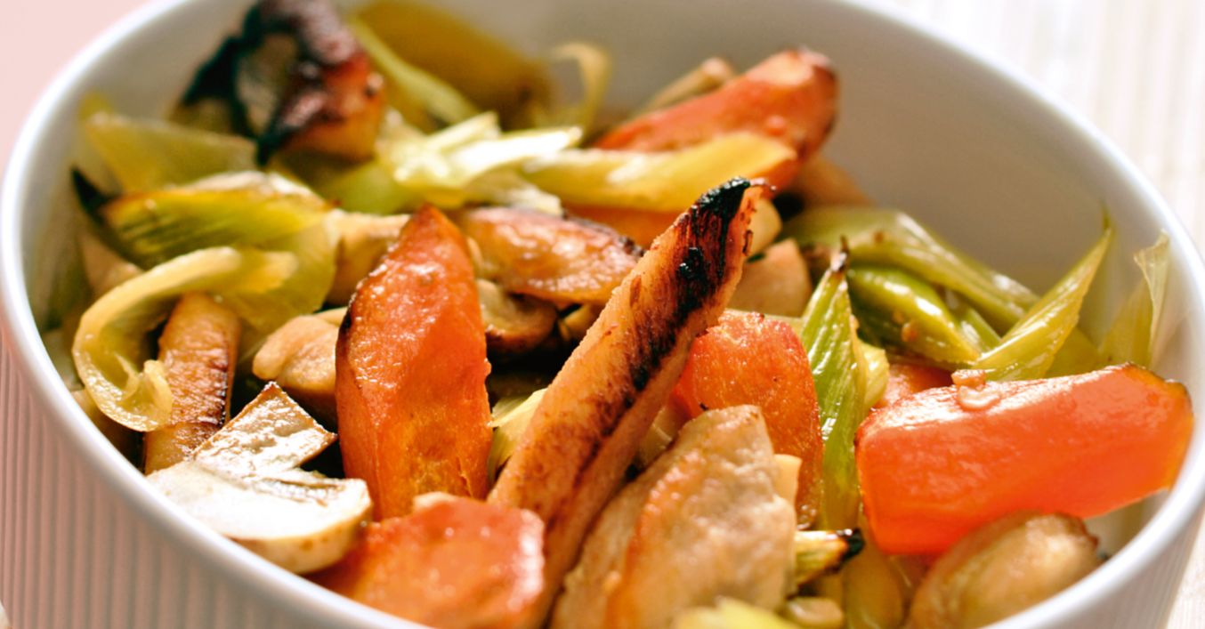 Върху тях се нареждат празът и морковите, нарязани на диагонални парчета с дължина 5-6 см. Добавят се останалата мазнина, виното, черен пипер, червеният пипер, дафиновите листа и се посолява.