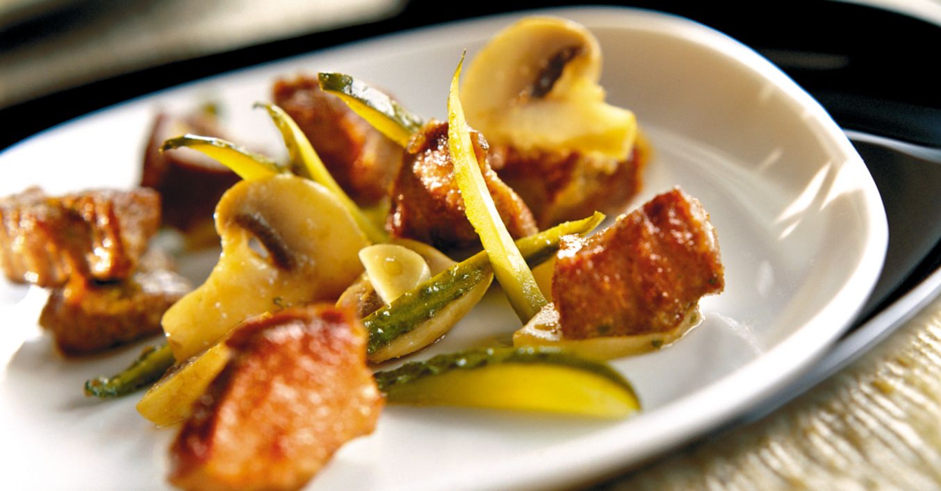 Налива се разтвореният в 200 мл вода гъбен бульон, оставя се да поври около 5-10 минути и се прибавят нарязаните на едро гъби и на ивички краставички. Всичко се вари, докато течността се изпари.