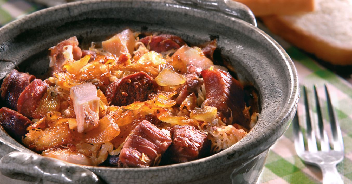 На дъното на гърнето се поставя част от предварително нарязаната на резени сланина. Отгоре се нарежда част от зелевата смес, върху нея се слага нарязаното на парчета свинско месо, отново зеле, после телешкото месо, като върху него се нареждат останалите резени сланина, пак зеле, пилешкото и кървавицата и се завършва със зеле. Наливат се виното и 2 ч. ч. вода и се покрива с отделените зелеви листа.