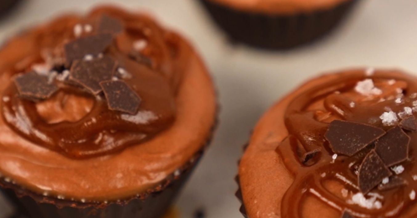 За шоколадовите чаши: Във форми за мъфини се слага хартия за печене. Формите се намазват равномерно с предварително разтопения шоколад (около 1,5 чаени лъжички шоколад на формичка). Шоколадовите чашки се оставят да стегнат в хладилника.