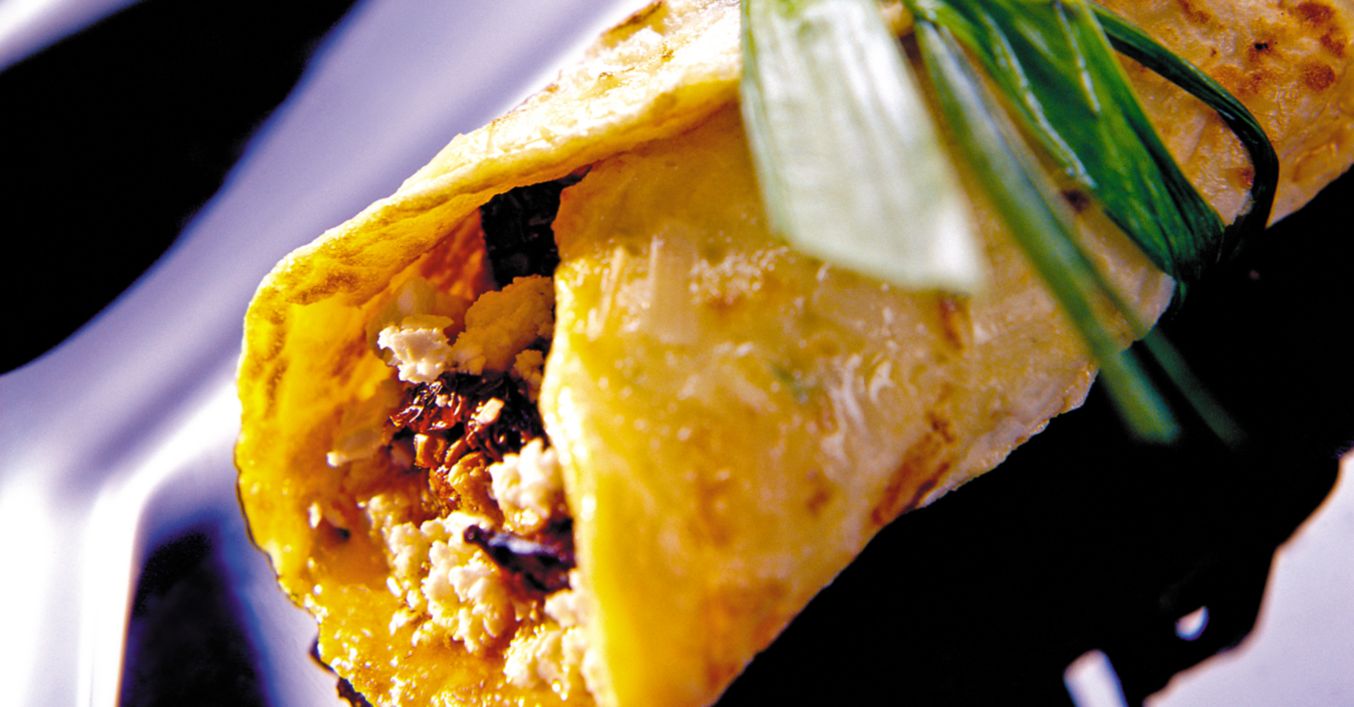 Зелената част на праза се разрязва по дължина, листата се отделят едно по едно и се бланшират за около минута в кипнала подсолена вода. Изваждат се, заливат се със студена вода, отцеждат се и се нарязват надълго така, че да се получат тънки лентички. 5. В средата на палачинката се поставя от пастета, завива се на руло, завързва се с лентичка бланширан праз и се сервира.