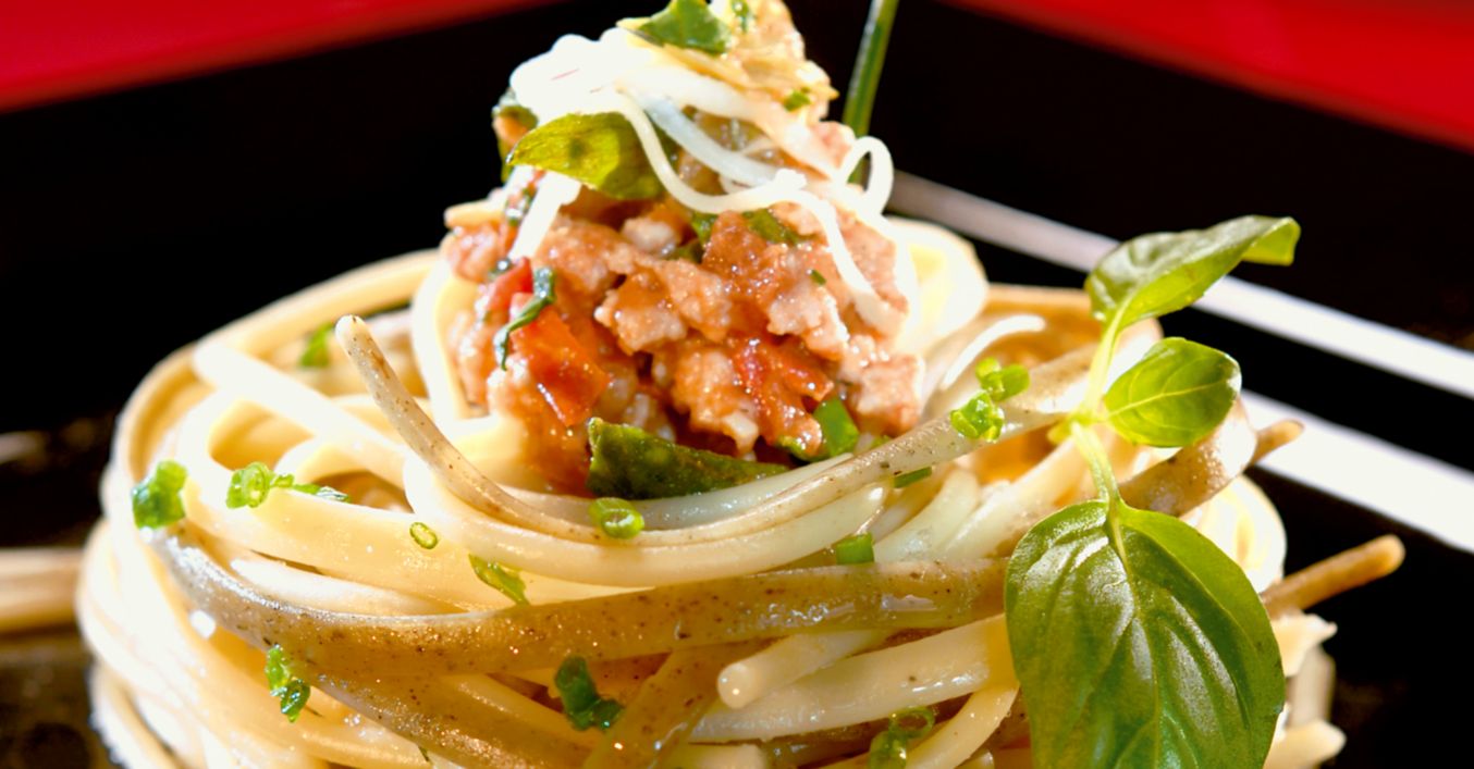 При сервиране всяка порция спагети се поръсва с нарязания на ситно и запечен бекон.