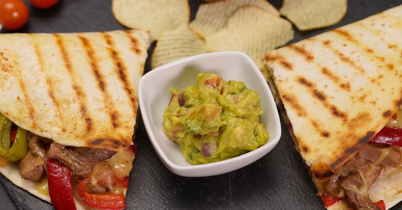 В загрят грил тиган се слага една тортила питка. Върху едната половина на питката се поръсва настърган кашкавал. Отгоре се сипват няколко лъжици от сместа с телешкото и зеленчуците. Поръсва се с още малко кашкавал и се похлупва с другата половина на питката. Оставя се така за 1-2 минути, за да се разтопи кашкавалът, след което питката се обръща. Готви се още 1-2 минути и се маха от котлона. Повтаря се с втората питка.