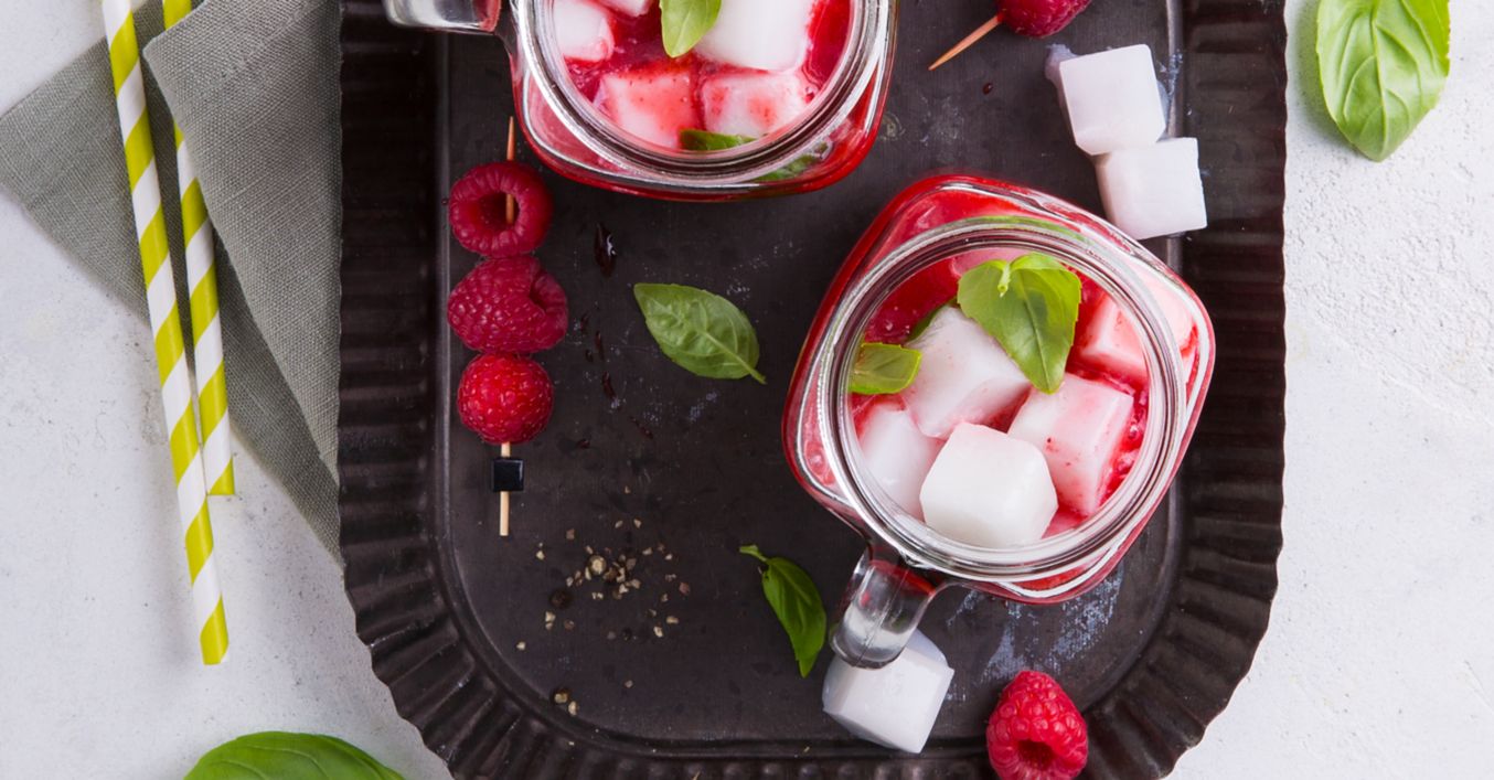 Добавете кубчетата лед от кокосово мляко. Нанижете малините, които заделихте, на дървено шишче. Украсете коктейла с тях, подправете с черен пипер и сервирайте.