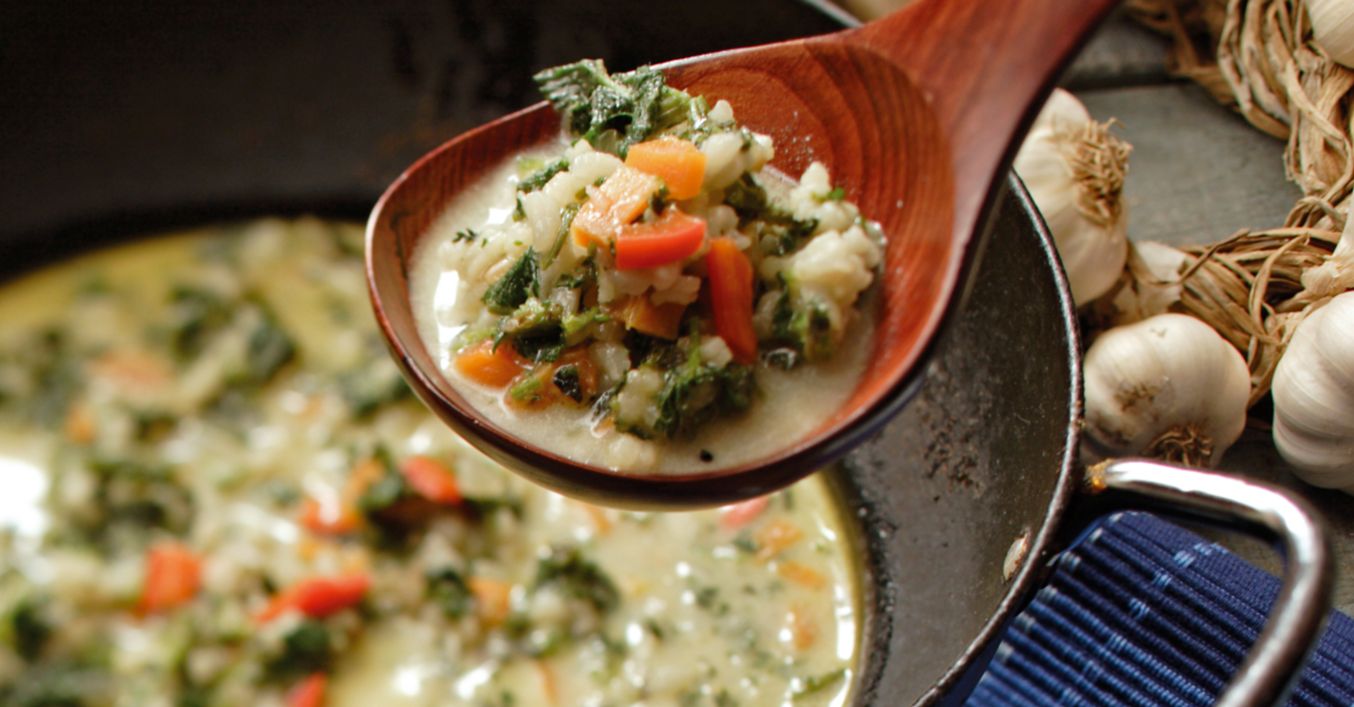 Доливат се около 800 мл вода и се добавя оризът. Супата се оставя да ври около 7–10 минути или докато оризът стане готов.