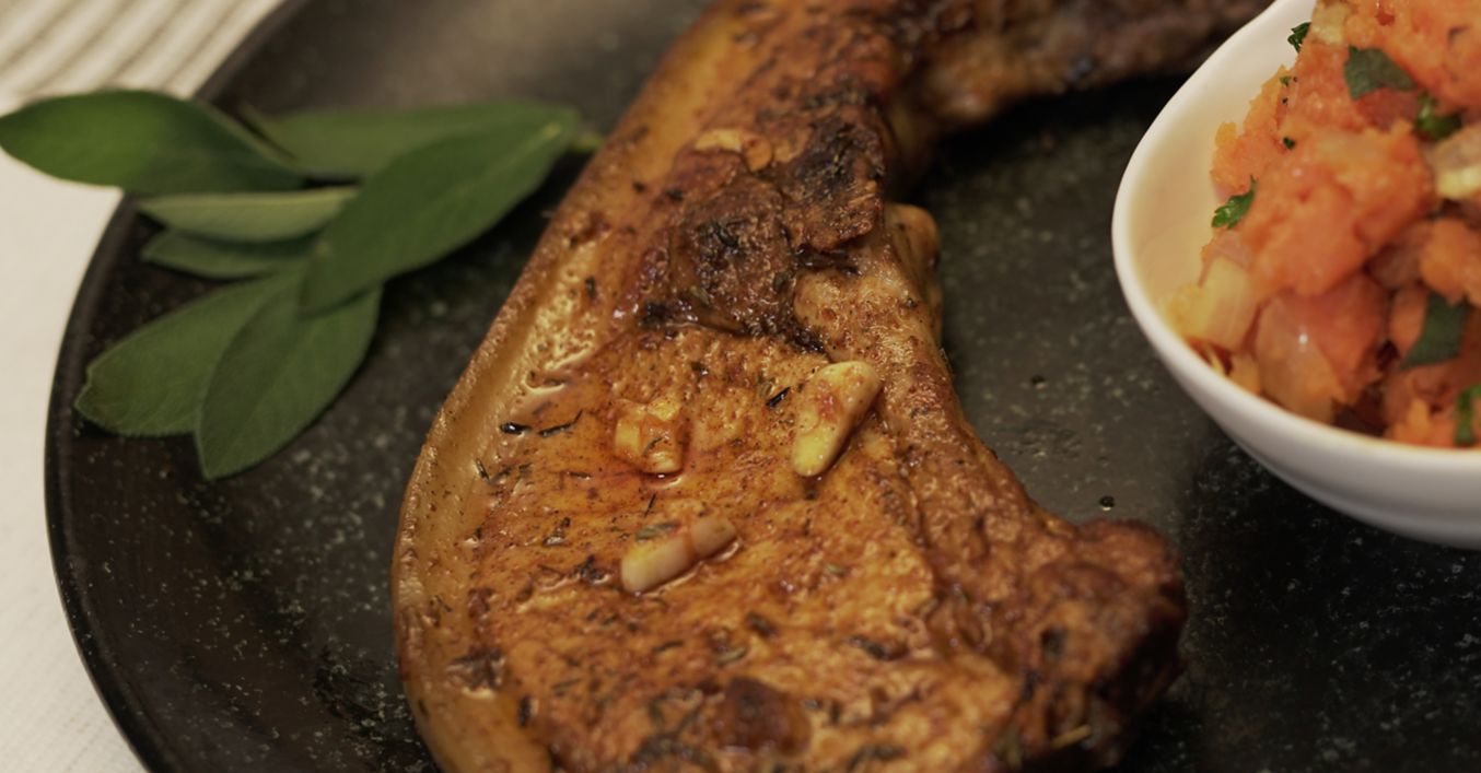 Подправките за марината на котлетите – 1 с.л. червен пипер, 1 ч.л. сол, 2 наситнени скилидки чесън, 1 ч.л. мащерка и 2 с.л. маслиново масло K-Classic, се смесват в купа и се изсипват върху котлетите. Овалват се добре, след което се оставят в хладилник да се овкусят за 20-30 минути.В загрят тиган се сипва 1 с.л. маслиново масло K-Classic и се слагат маринованите котлети. Готвят се 2-3 минути, след което се обръщат от другата страна и се поливат със зехтина, подправките и соковете от месото в тигана. По този начин месото ще стане по-крехко. След като се готвят още 2 минути, котлетите се преместват в загрята на 200 °С фурна и се пекат 10-12 минути.През това време нарязаните на кубчета сладки картофи се сваряват в пилешкия бульон за 10-15 минути.В загрят тиган се слагат 1 с.л. маслиново масло K-Classic и наситнените ½ глава лук и 2 скилидки чесън. Овкусяват се с черен пипер и сол. Разбъркват се и се готвят 3-4 минути, след което се прибавят сварените сладки картофи. Разбъркват се и се намачкват с уред за мачкане на картофи (или вилица). Накрая се добавят пресният кориандър и салвията, пюрето се разбърква и се маха от котлона.