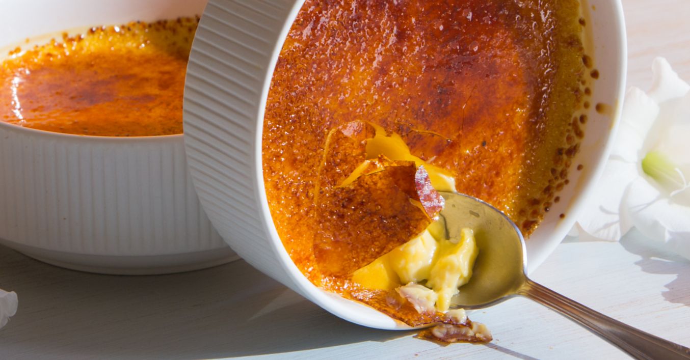 След като брюлето изстине, се поръсва с кафявата захар, която се пърли с горелка, докато се карамелизира. Ако не разполагате с горелка, можете да карамелизирате захарта на крема в силно загрята фурна на горно печене.