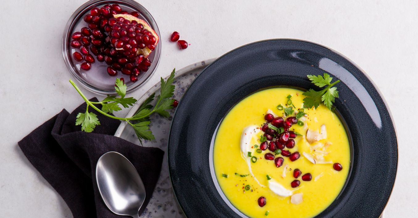 Готовата супа се разпределя в четири купички. Отгоре се слага по лъжица сметана, прибавят се семена от нар, бразилски орехи и се сервира.