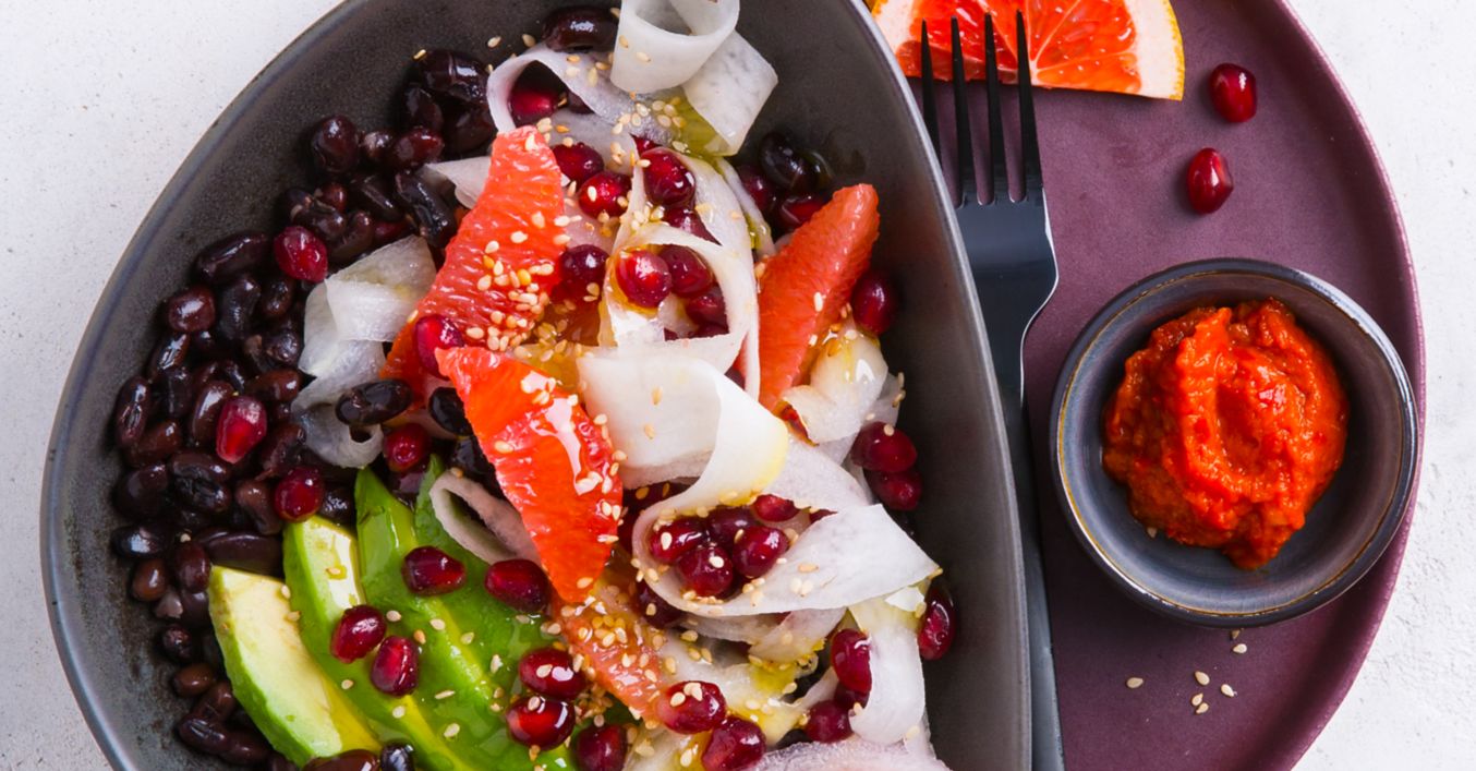 Бобът, ряпата и парченцата грейпфрут се разпределят в две купи. Гарнира се с авокадо, овкусен нар и лютеница.