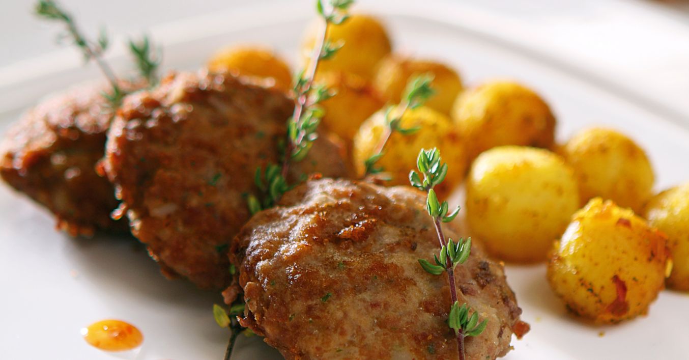 Картофките се слагат в намазнен съд и се пекат 8–10 минути в загрята на 200 градуса фурна, докато получат златиста коричка. Кюфтенцата се поднасят с картофките и се украсяват с мащерка.