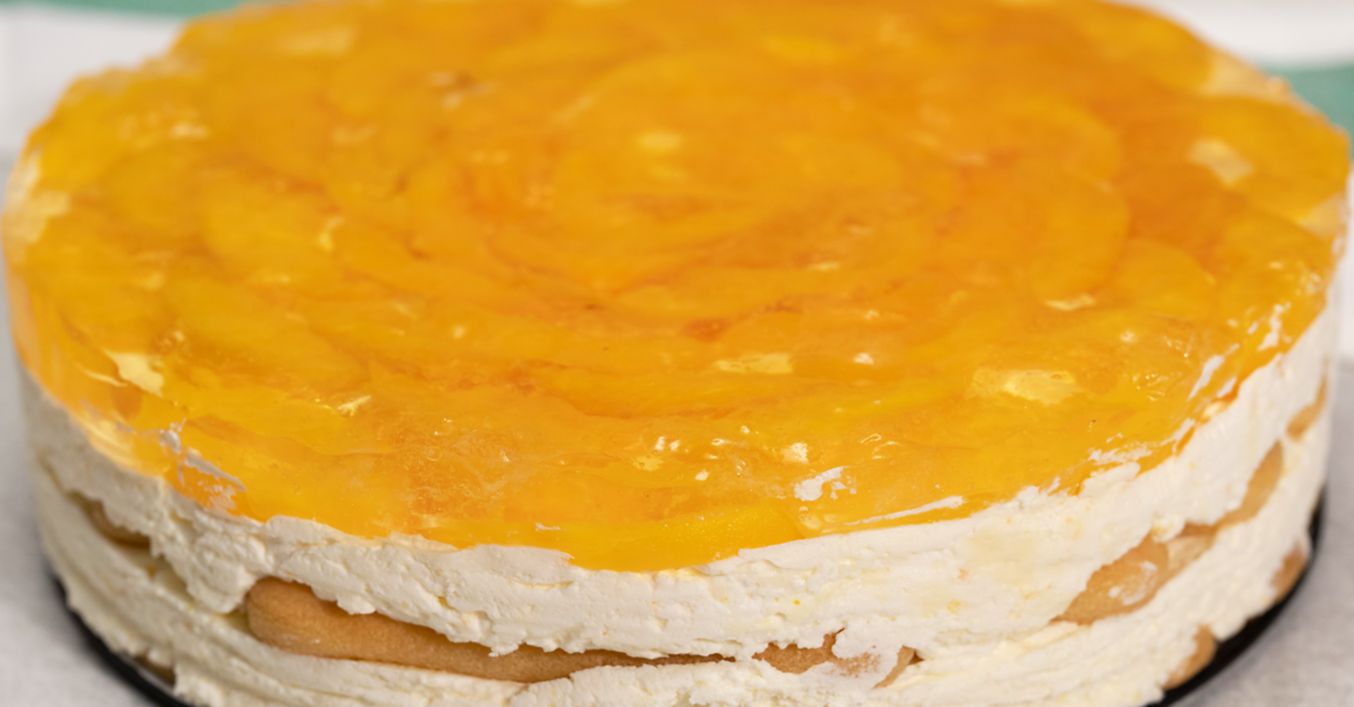Бишкотите се потапят в сиропа от белените праскови и се подреждат на дъното на тава с подвижно дъно. Отгоре се сипва половината от крема и се заглажда. Подрежда се втори ред бишкоти, напоени в сироп, следвани от останалия крем. Тортата се заглажда и отгоре се нареждат нарязаните праскови. Оставя се в хладилника докато се приготви желето.