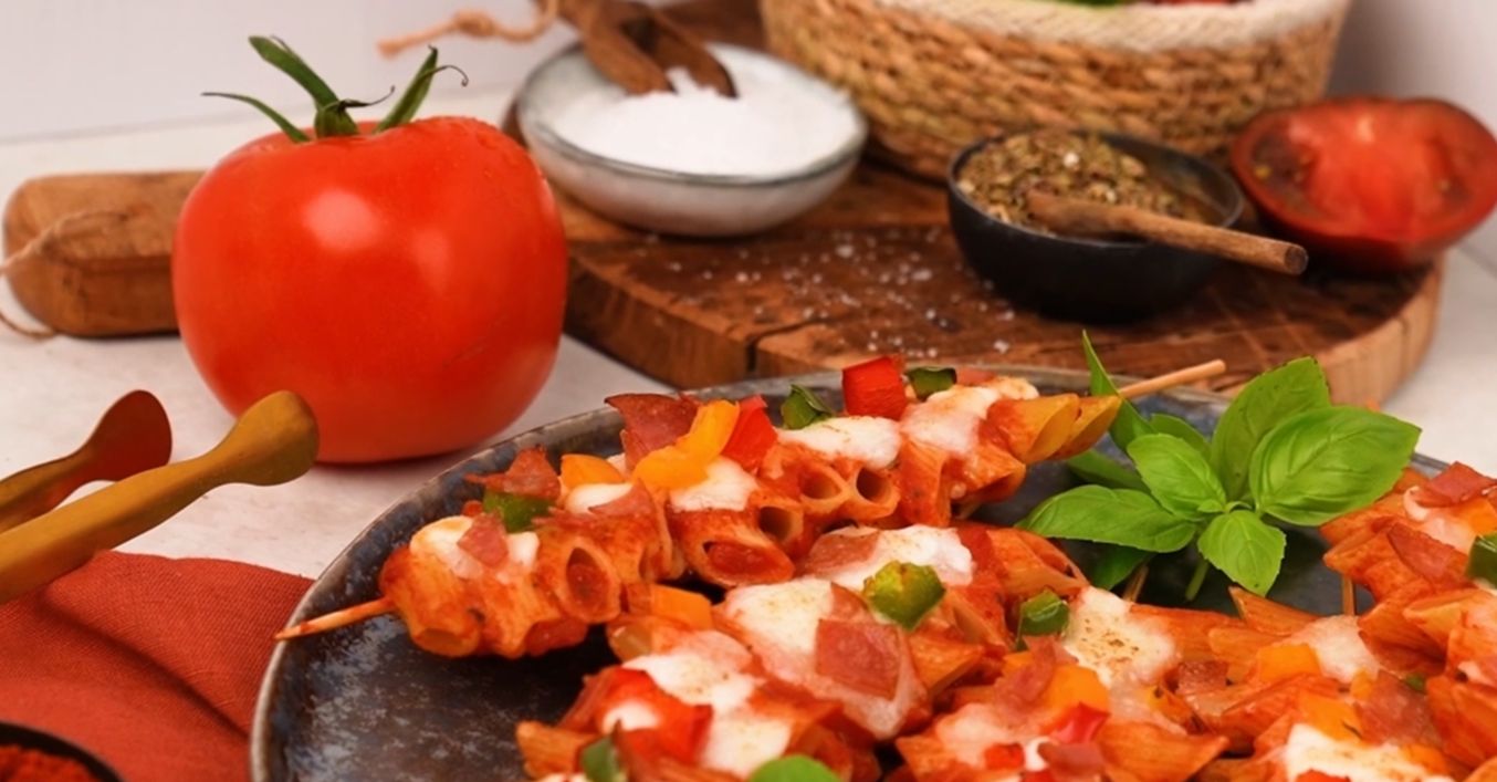Пастата се сварява в подсолена вода според указанията на опаковката и се отцежда. Вече свареното пене се ниже на шиш.
