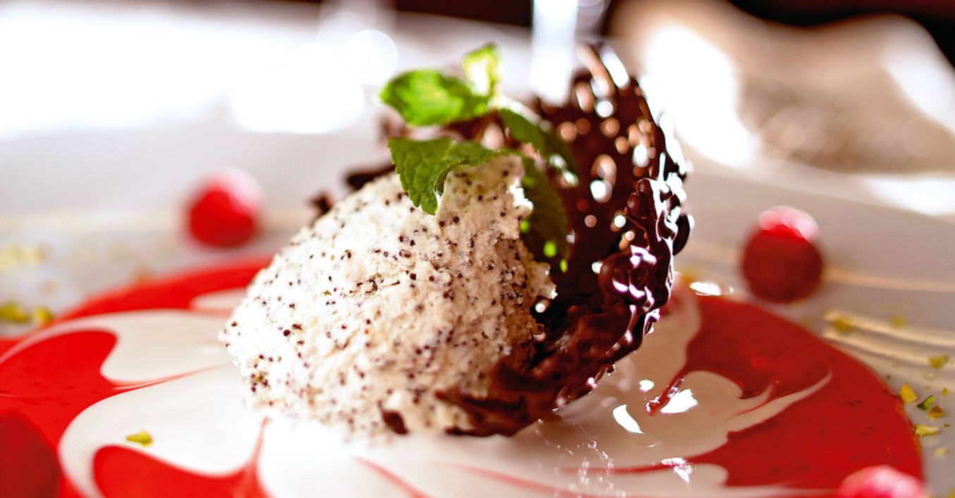 Поднася се със соса, приготвен от смлените със захарта малини, и се гарнира с пресни. По желание се украсява с кошничка от шоколад.