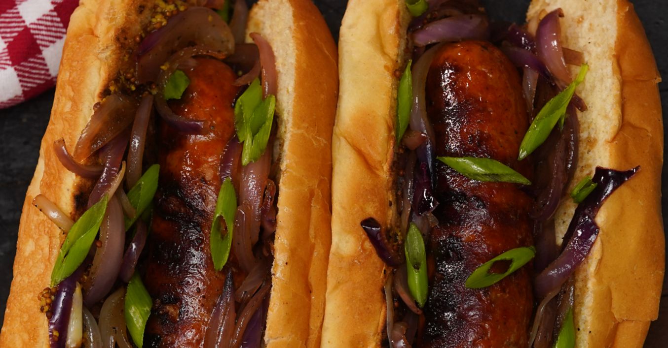 След като хлебчетата са готови се намазват с горчица, добавя се карамелизиран лук и наденица и питките се затварят. По желание, сандвичите се сервират поръсени със зелен лук.
