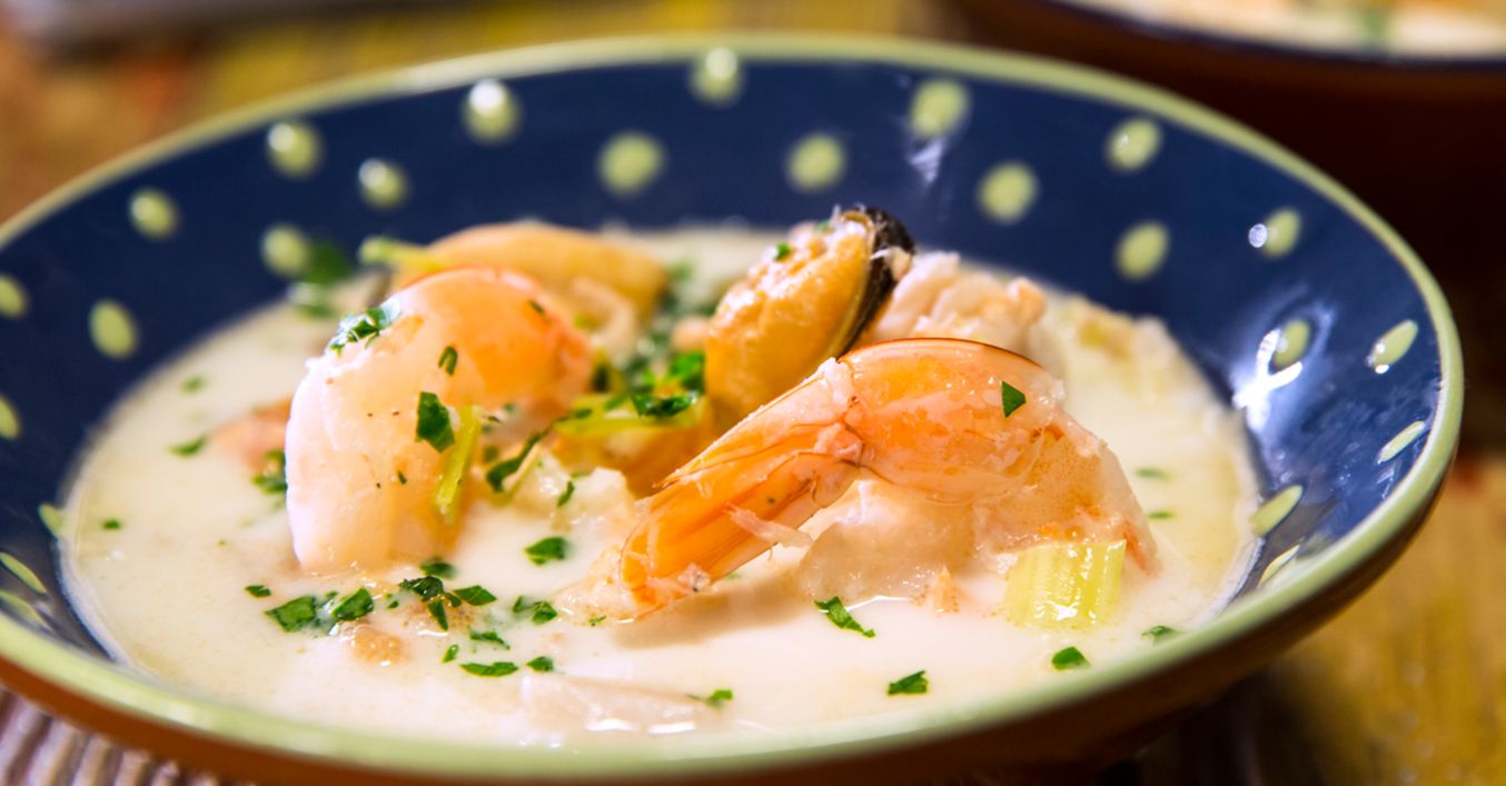 Морковите, целината и празът се обелват, почистват се и се нарязват на много ситно. Сипват се в тенджерата с бульона и се варят, докато омекнат. Наливат се брендито и сметаната. Прибавят се морските дарове и филето от бяла риба, нарязано на кубчета.