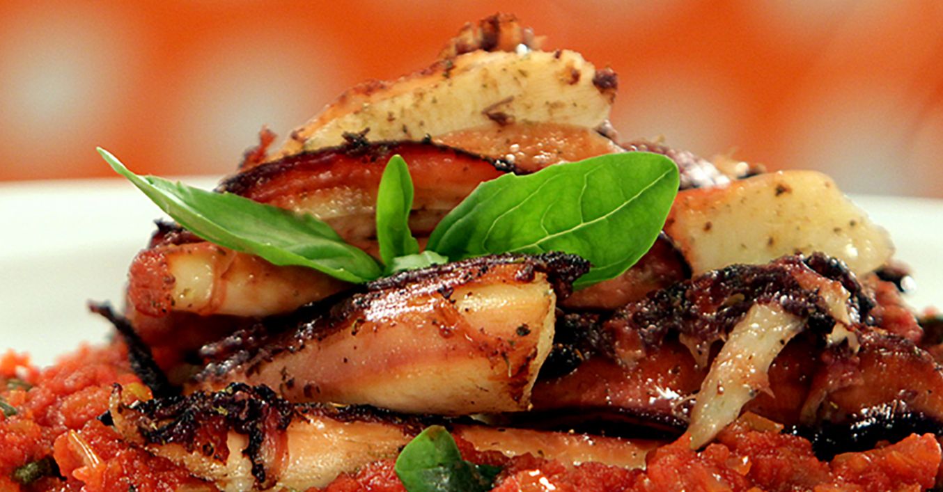 В чинии се поставя от доматения сос, отгоре се подреждат парчета октопод. Гарнира се с накъсани листа пресен босилек и се сервира.