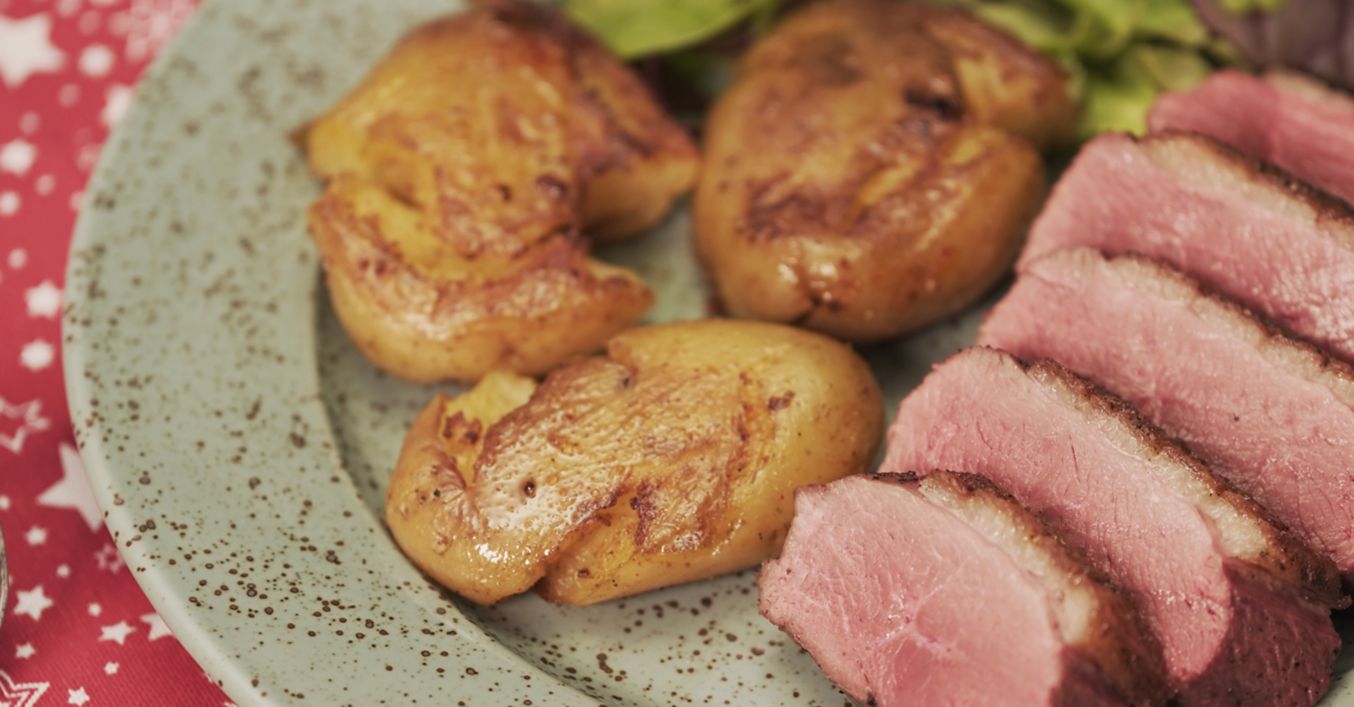 Картофите се сваряват цели в подсолена вода. След като се сварят, се слагат върху кухненска дъска и се натискат един по един с подходяща купичка или съд, така че да се сплескат. Вече сготвеното патешко филе се маха от тигана и на негово място, в останалата мазнина се слагат смачканите картофи. Поръсват се с ½ ч.л. сол и ½ ч.л. червен пипер. Когато станат златисти, се обръщат и се овкусяват с още ½ ч.л. сол и ½ ч.л. червен пипер. Готвят се още 2-3 минути и се махат от котлона.