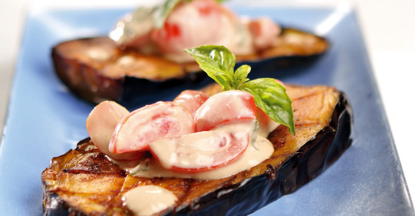 Топлите патладжани се сервират залети със студения сос и украсени с листа мента.
