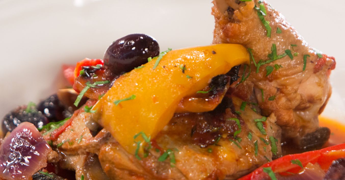 В останалия зехтин се запържват камбите, към тях се прибавят лукът и чесънът, докато леко омекнат. Сипва се балсамовият оцет и зеленчуците се прехвърлят в тавата при пилешкото месо.