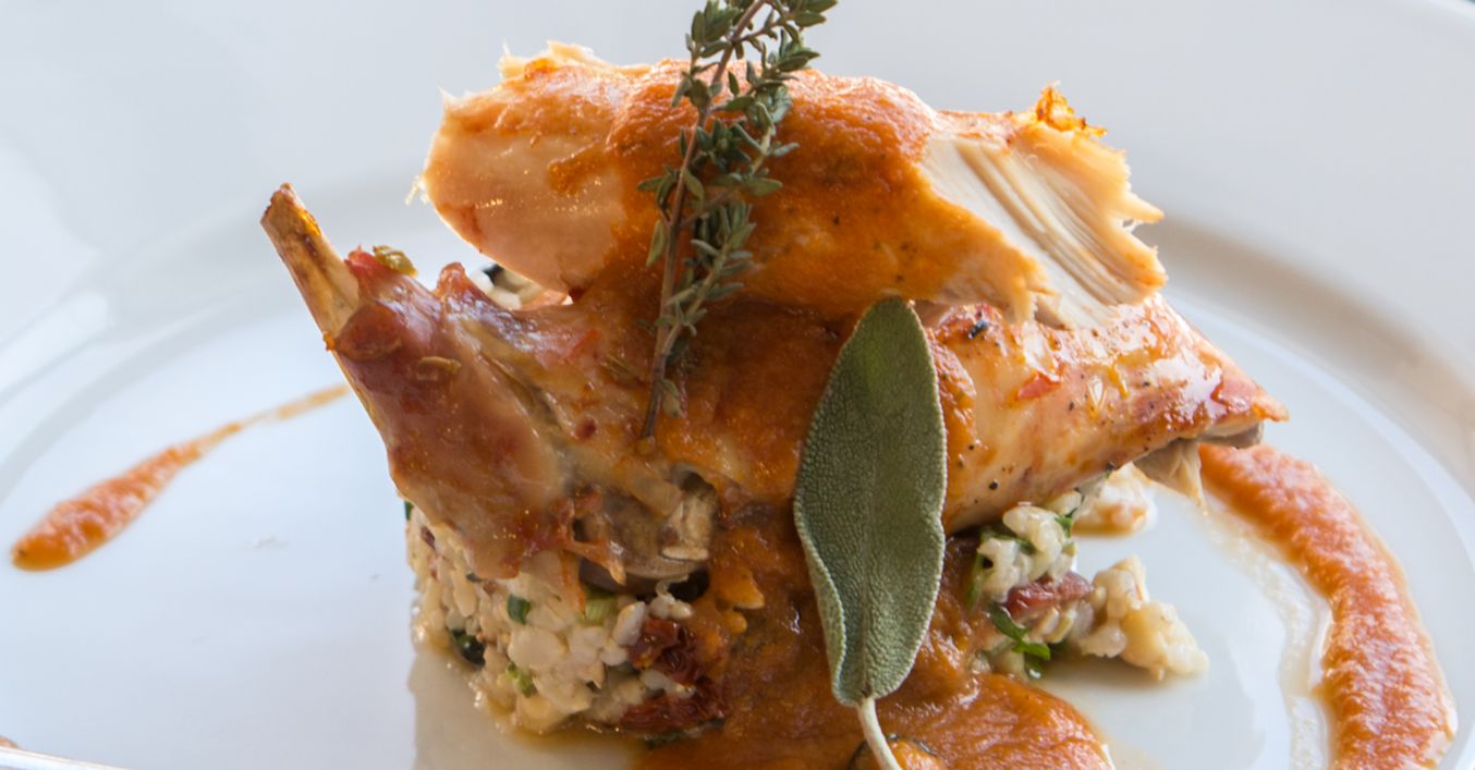 Печен заек с кафяв ориз и зеленчуци