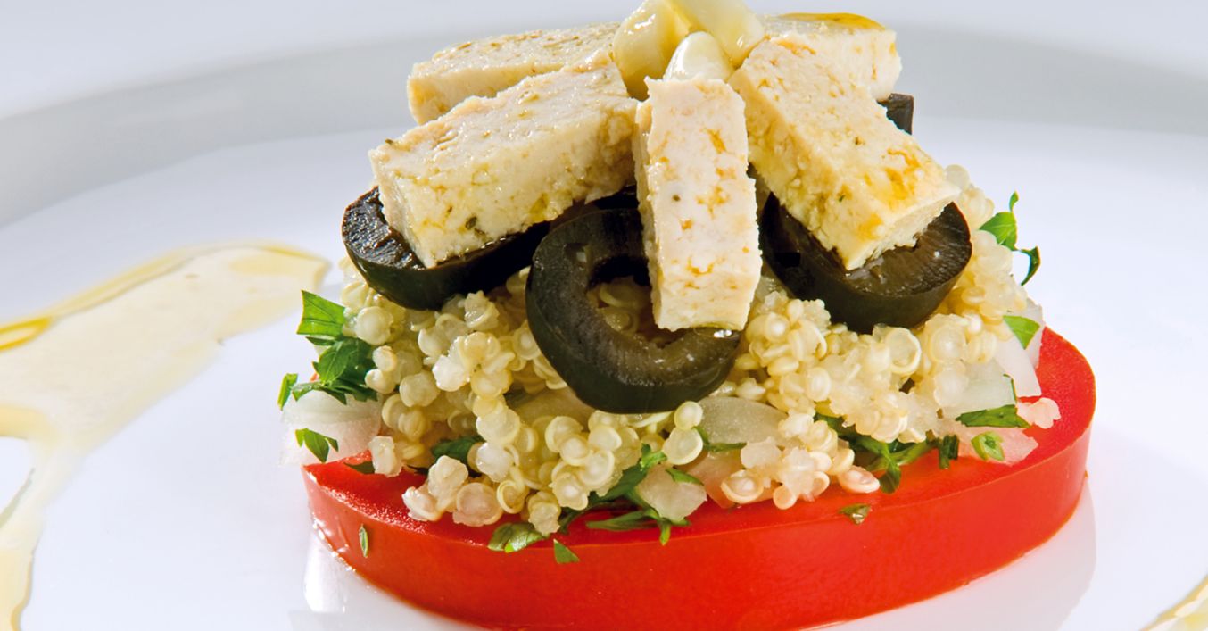 В подходящи чинии се нареждат шайби домати, поръсват се с лука и магданоза, след това се добавя киноата, поставят се маслините и накрая маринованото тофу. Всяка салата внимателно се залива с част от маринатата.
