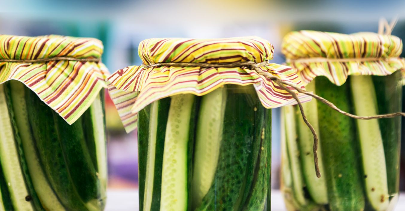 В шест големи буркани се разпределят чесънът, джинджифилът, зърна пипер и краставичките, заливат се с маринатата и се затварят добре.