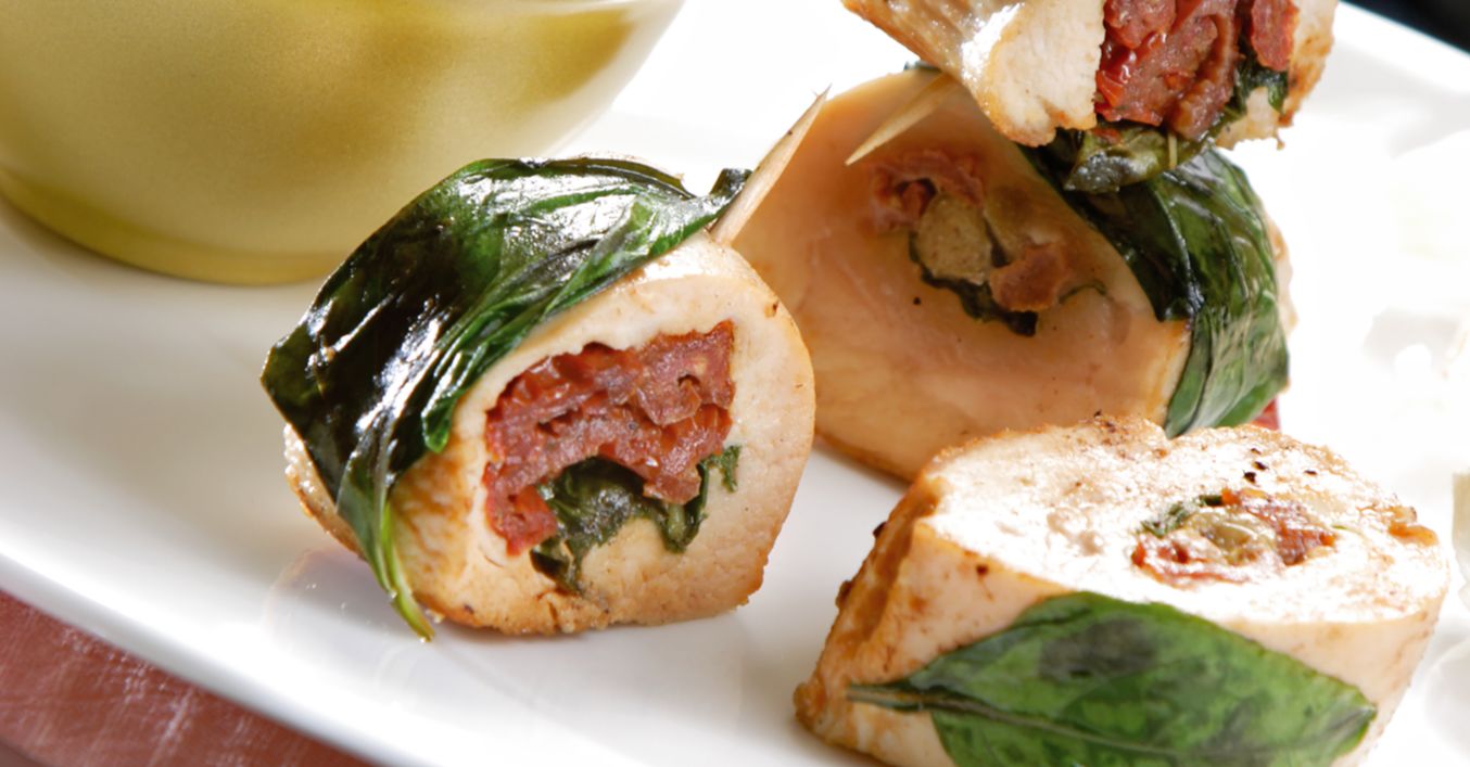 Филетата се разтварят като шницел с помощта на нож. Върху тях се разстилат доматите, спанакът и каперсите и се оформят рула.