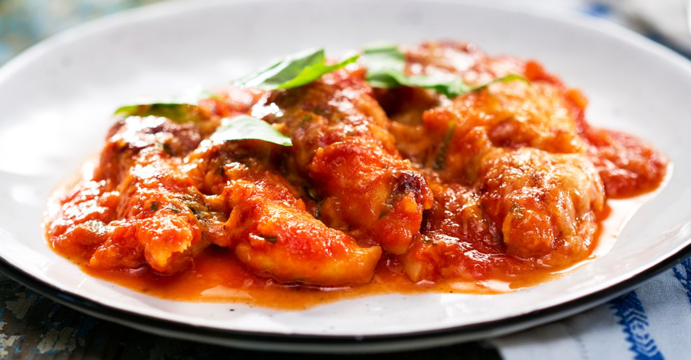 Лукът и чесънът за соса се накълцват и се запържват в останалото маслиново масло. Наливат се доматите.