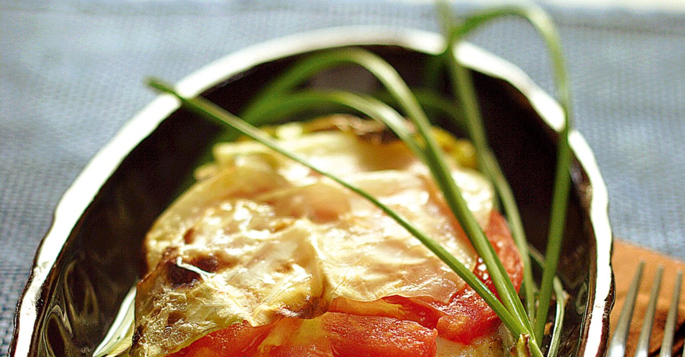 Всяко филе се поставя върху лист зеле, покрива се с шайби домат, слага се стрък див чесън и се завива с още един лист зеле.
