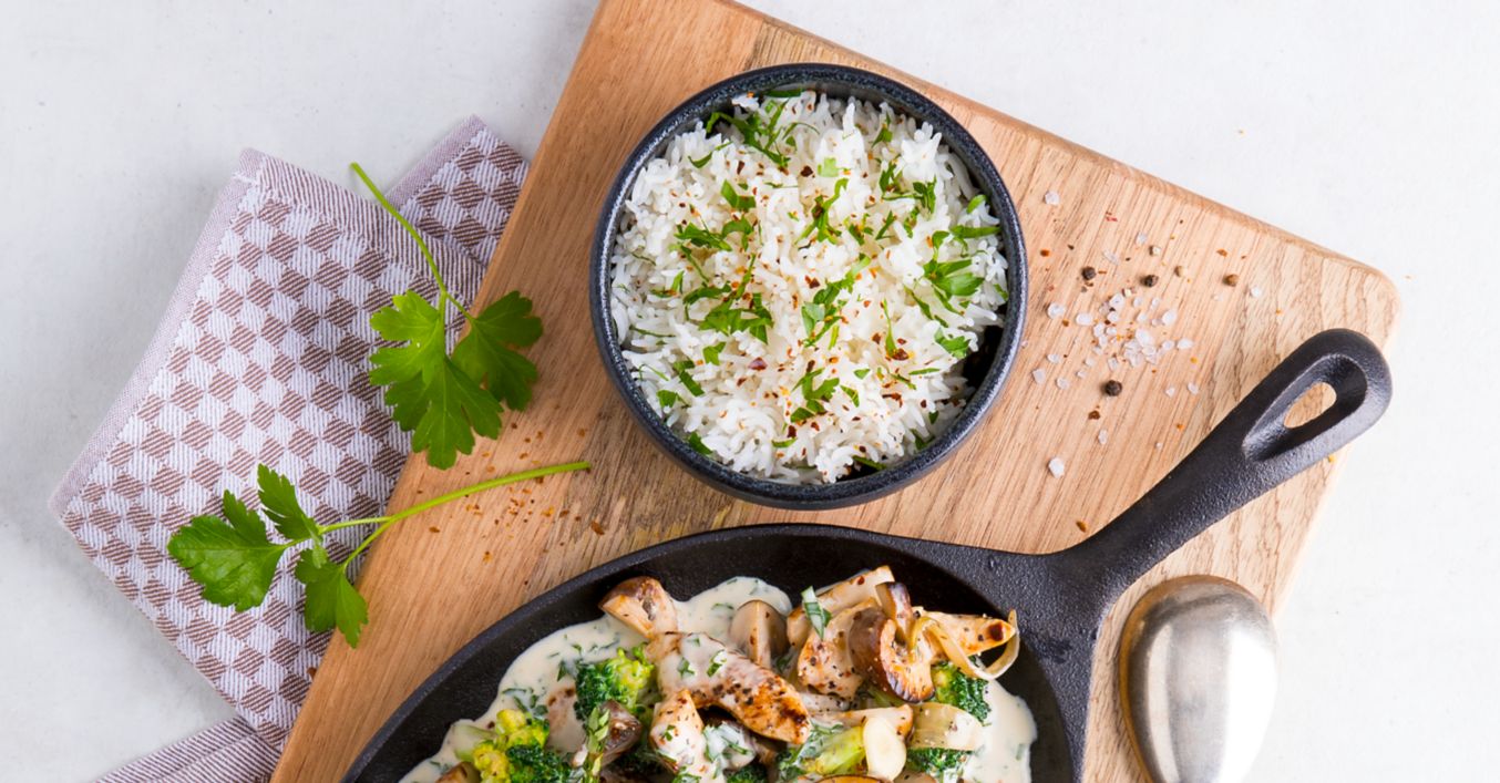 Месото се измива, подсушава се и се нарязва на ленти, напречно на мускулните влакна. Гъбите се почистват и нарязват. Броколито се нарязва на парчета с големината на хапка.Лукът и чесънът се обелват и нарязват.Мащерщата се измива, а листенцата се отделят. Магданозът също се измива и нарзява.Оризът се измива в сито. Оставя се да заври с 400 мл подсолена вода. Прецежда се, покрива се с вода и оставя да къкри на слаб огън за 10 минути. В края на готвенето тенджерата се отмества от котлона и се оставя ориза да набъбне в покритата тенджера за няколко минути.Междувременно олиото се загрява в тиган с незалепващо покритие. Месото се поръсва с червен пипер и се запържва от всички страни за четири минути, след което се изважда от тигана.Температурата се намалява леко. Добавя се лукът и чесънът в тигана и задушава, докато станат прозрачни.Добавете гъбите, броколито и мащерката и запържете за няколко минути.Залейте сместа от гъби и броколи със зеленчуковия бульон. Оставете да заври и добавете месото.Добавете овесената сметана.Разтворете кузу/нишестето в 2 супени лъжици студена вода и го добавете към соса. Оставете да къкри на умерен огън за няколко минути, докато зеленчуците се сварят. Овкусете със сол и черен пипер.Поднесете пилешките лентички с ориз и поръсете с магданоз.