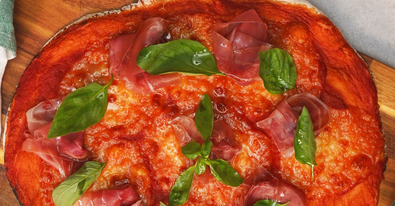 Пицата се изважда от фурната и отгоре се нареждат прошутото и листенцата пресен босилек. Полива се с малко маслиново масло и се сервира.