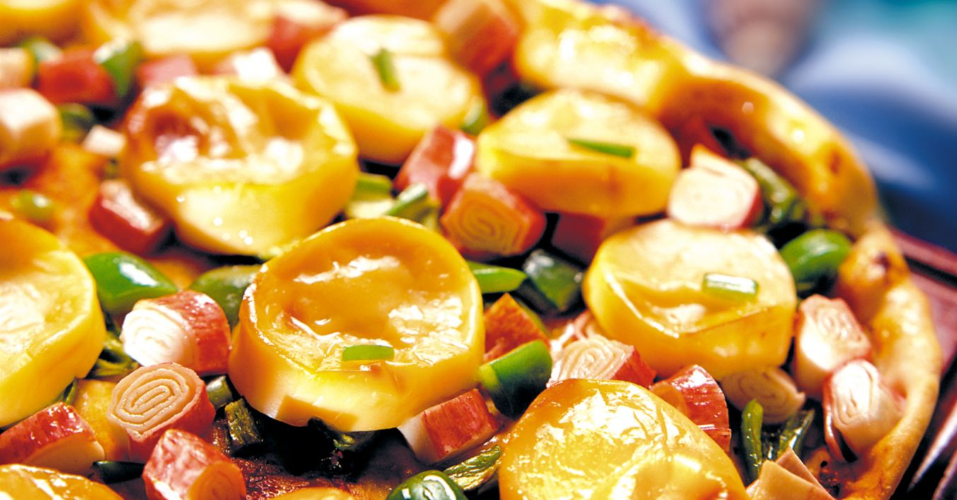 Втасалото тесто се разделя на две топки, разточва и се разпределя в намаслени тави с диаметър 26–30 см. Краищата на тестения кръг се изтеглят с пръсти и се оформя ръб с височина 1 пръст. Блатовете се намазват с готовия сос, отгоре се подреждат нарязаните на колелца рулца от раци, покриват се със сиренето, нарязано на филии и се поръсват с босилек. Пицата се пече 10-15 минути в сгорещена до 220-250°С фурна.